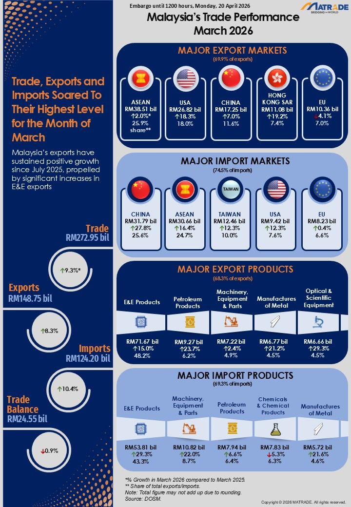 On a quarterly basis, Malaysia's trade expanded 10.4% to RM789.85bil compared with the first quarter of 2025. Exports during the January-March period rose 12.7% to RM426.53bil while imports increased 7.7% to RM363.31bil, resulting in a trade surplus of RM63.22bil.