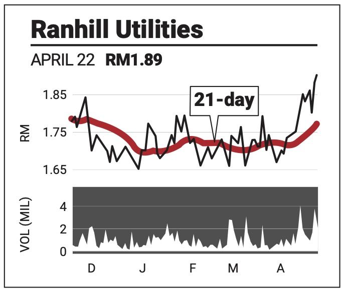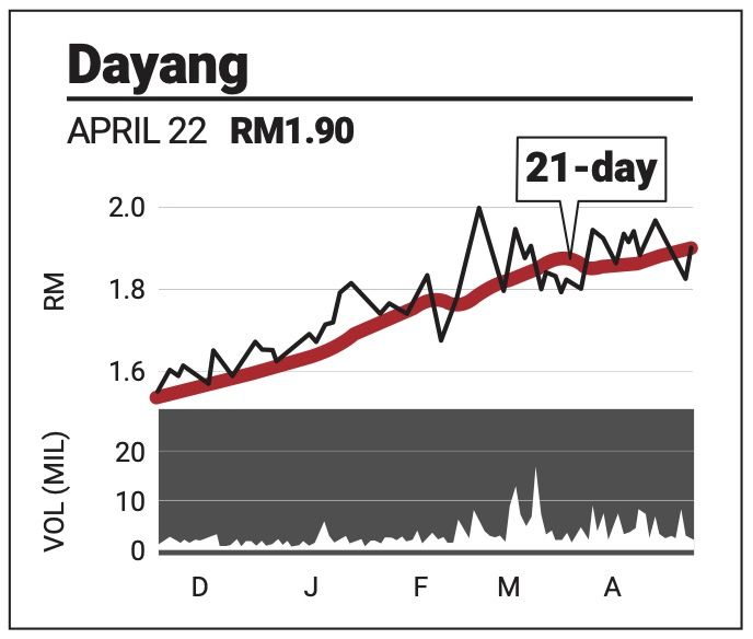 However, the share remains trapped by the short-term 14- and 21-day SMA lines, indicating resistance as it attempts to return to RM2 levels of trading.