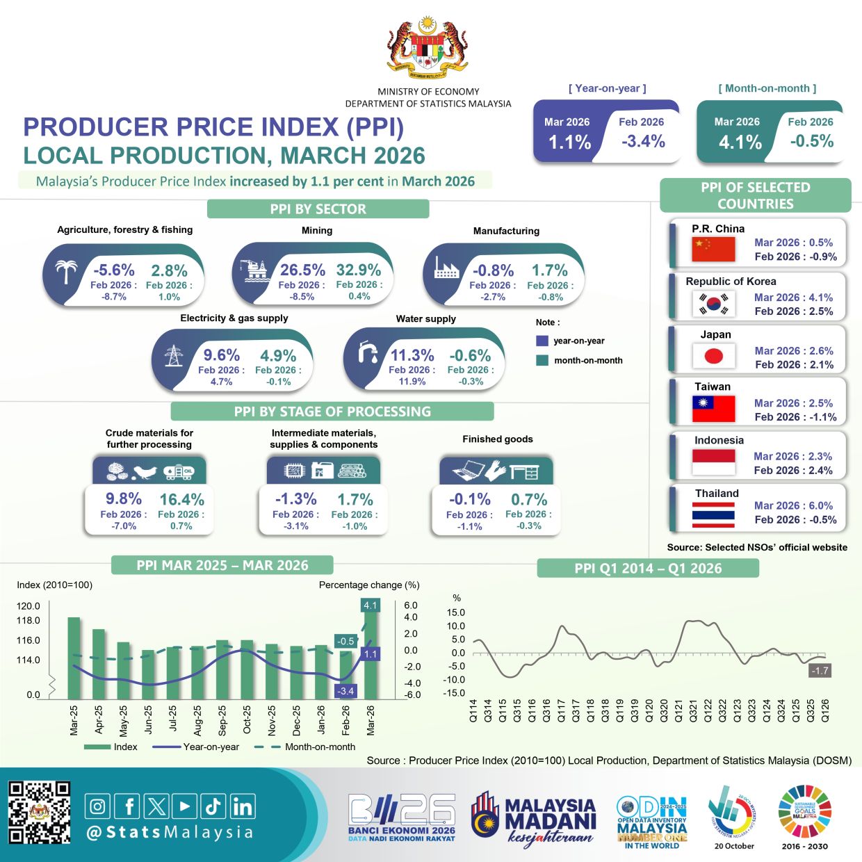 PETALING JAYA: Malaysia’s producer price index (PPI) rose 1.1% year-on-year in March 2026, reversing a 3.4% decline in February, as higher global commodity prices lifted producer costs, according to the Statistics Department.