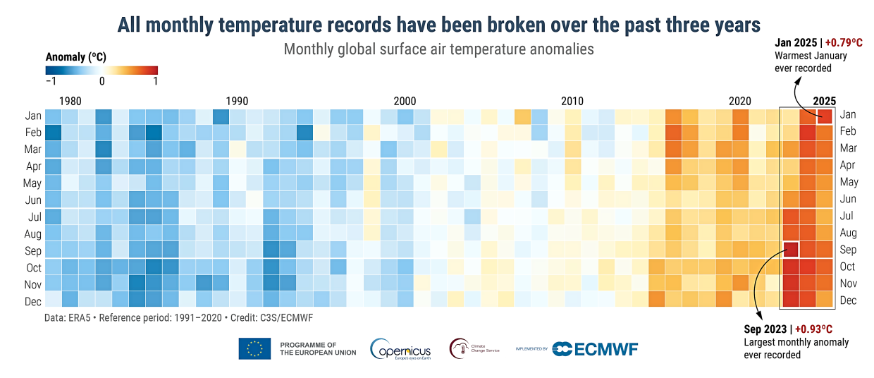Although 2025 as a whole did not break the temperature record, January 2025 was the warmest January ever recorded. Annual surface air temperatures were above the 1991-2020 average across 91% of the globe.