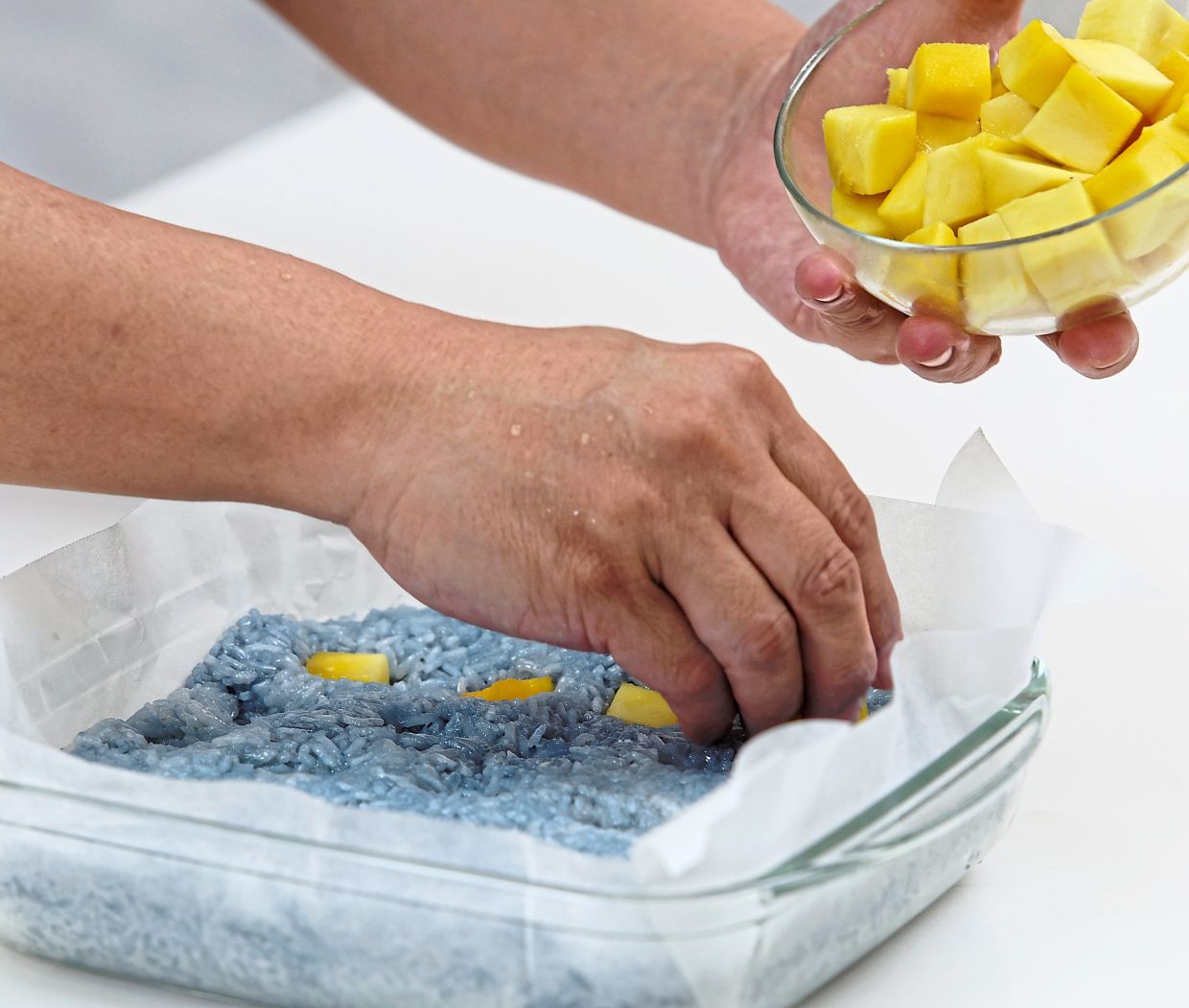 Do note that the glutinous rice will absorb a lot of the blue colour when cooked.
