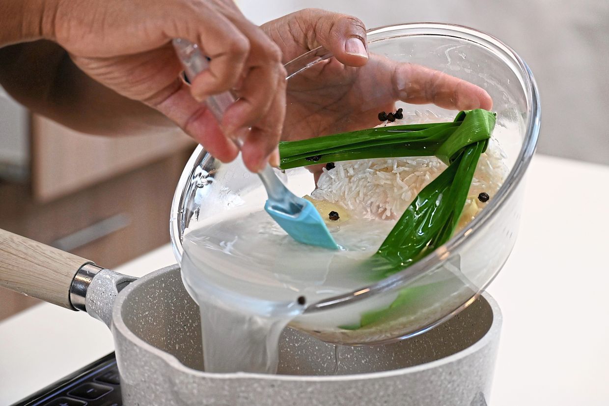 Add the soaked rice, including the pandan leaf, ginger and peppercorns, and three cups of water.