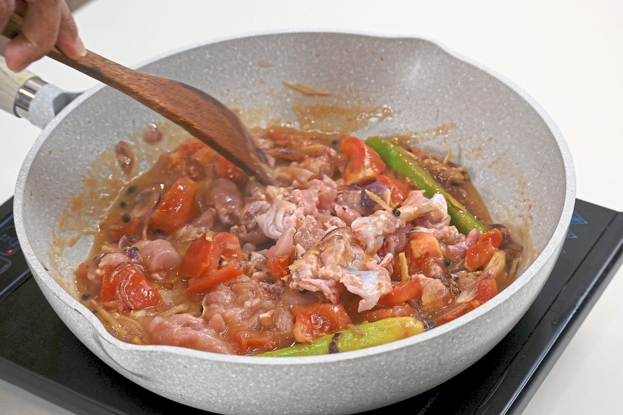 Throw in the chopped tomatoes and stir again. If the mix is dry, add some water. Cook until the tomatoes are soft.