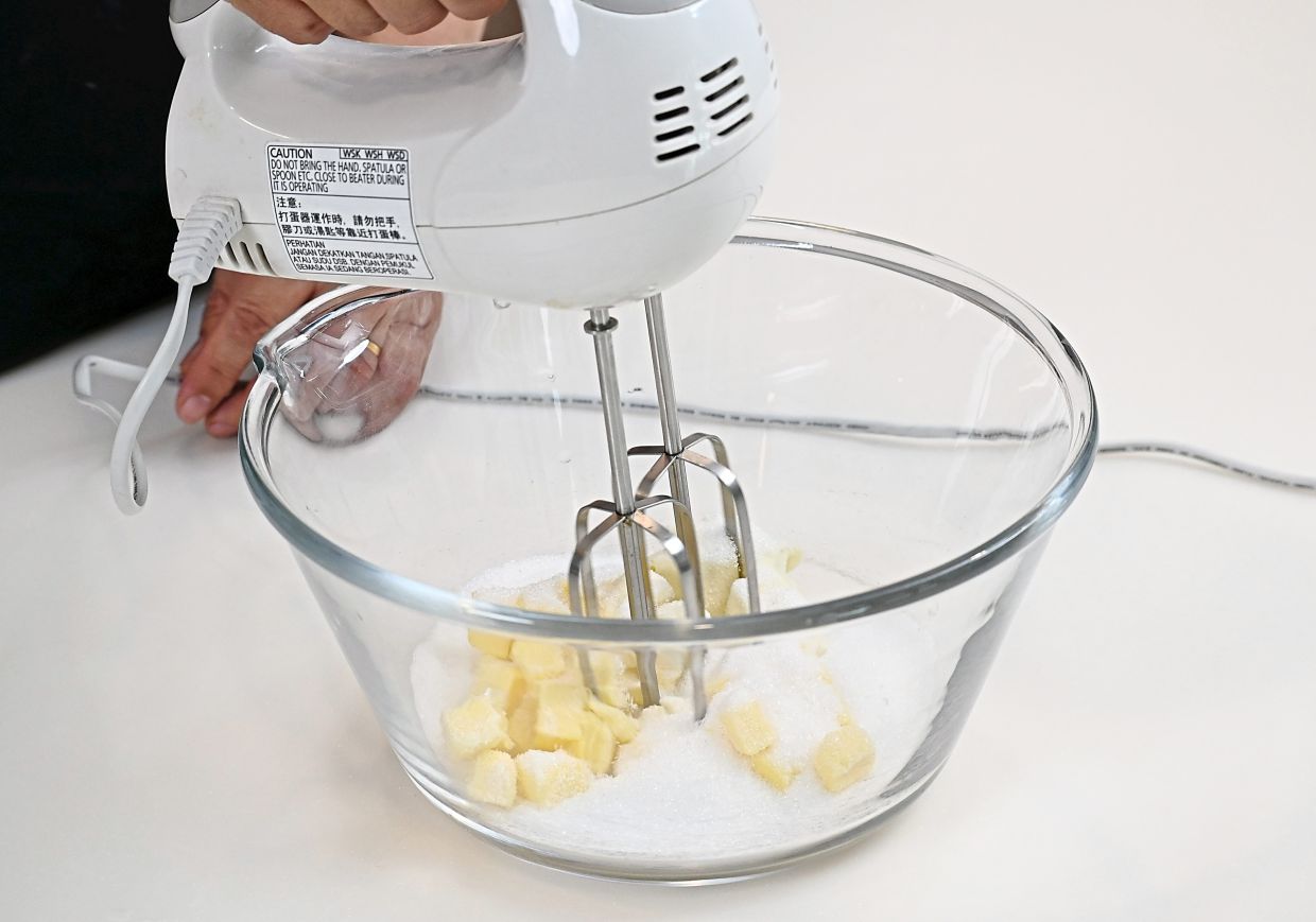 To prepare the dough, beat butter, cream cheese and sugar in a large mixing bowl until fluffy.