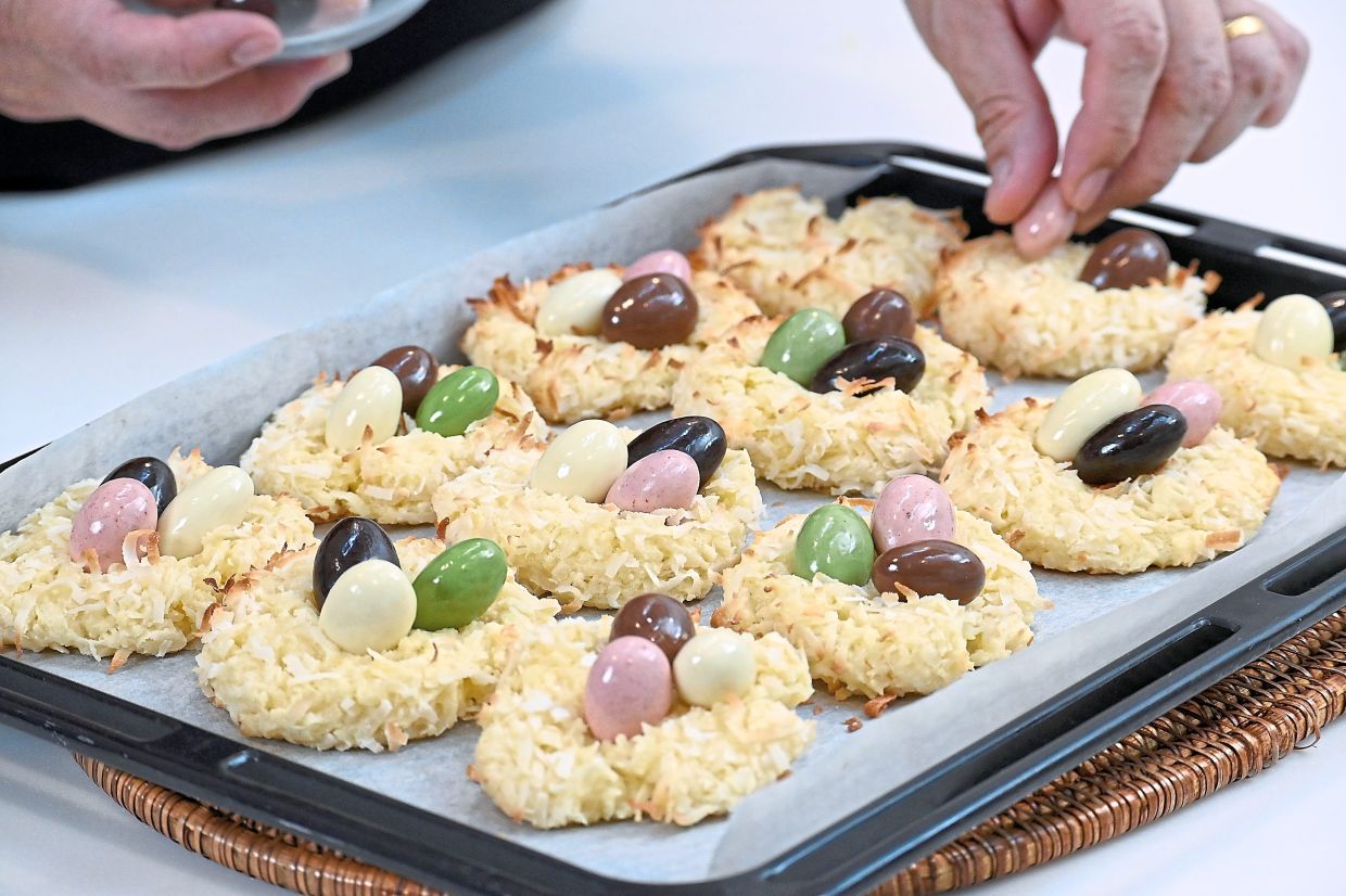 With their crisp golden shells, chewy coconut interiors and indulgent chocolate centres, these macaroon nests are a delightful addition to any Easter table. Happy baking!