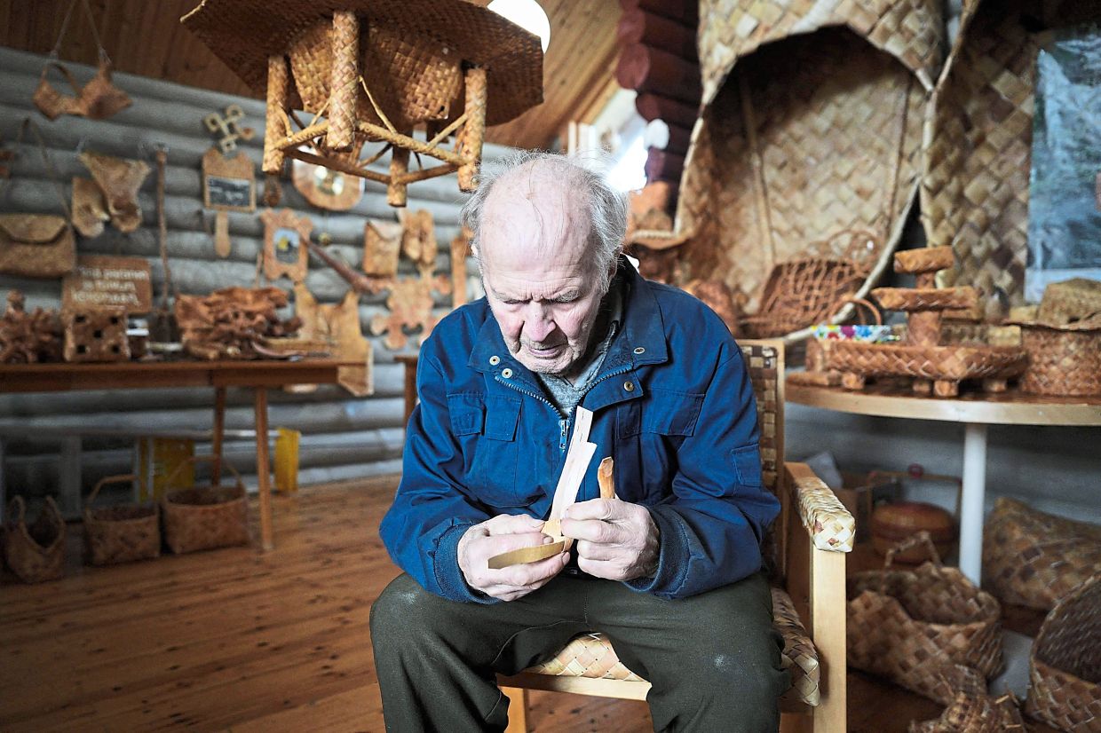 In his rustic cabin in the forests of southern Finland, 87-year-old Erkki Pekkarinen carves delicate strips of birch bark with his knife, before intricately weaving them into beautiful objects.