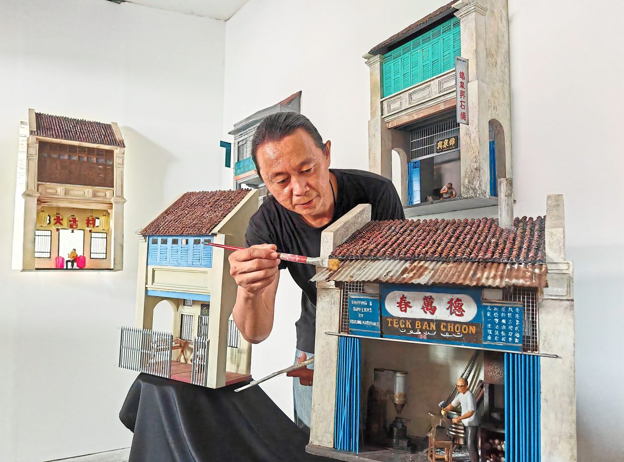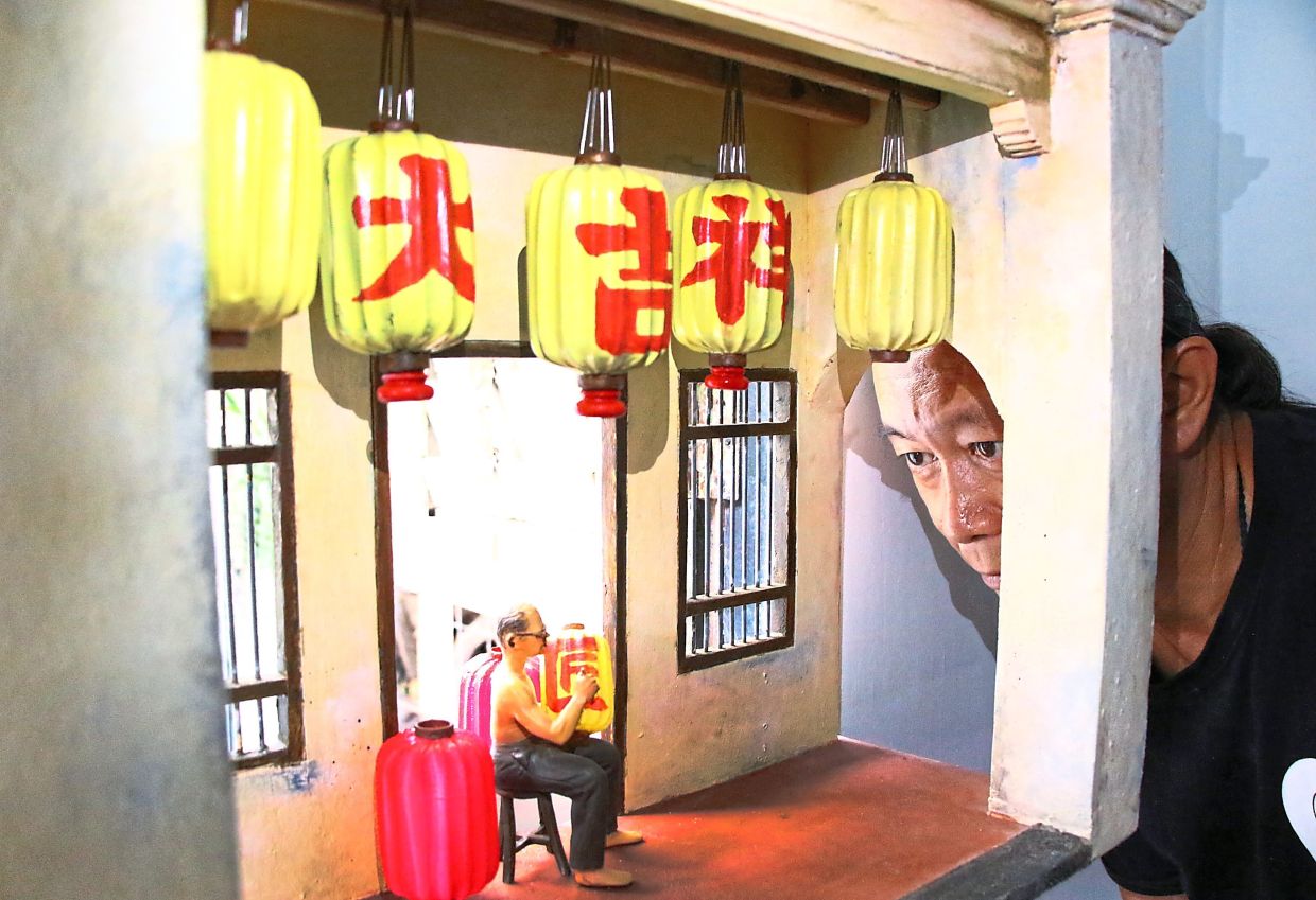 Low looking at his recreation of the late lantern maker Lee Ah Hock and his now-demolished Tai Keat Seong shophouse along Magazine Road in George Town. Photo: K.T. GOH/The Star