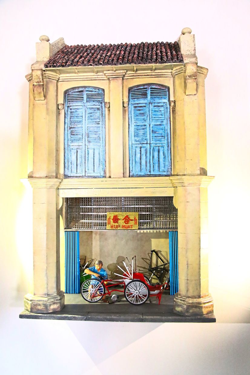 The detail to these works is remarkable. Those familiar with Penang’s historic shophouses will appreciate the accordion-style metal gates, carved timber windows and air vents seen on the lower level.