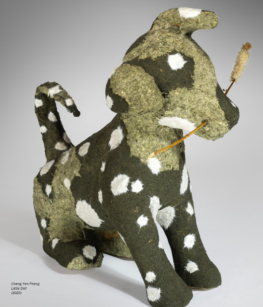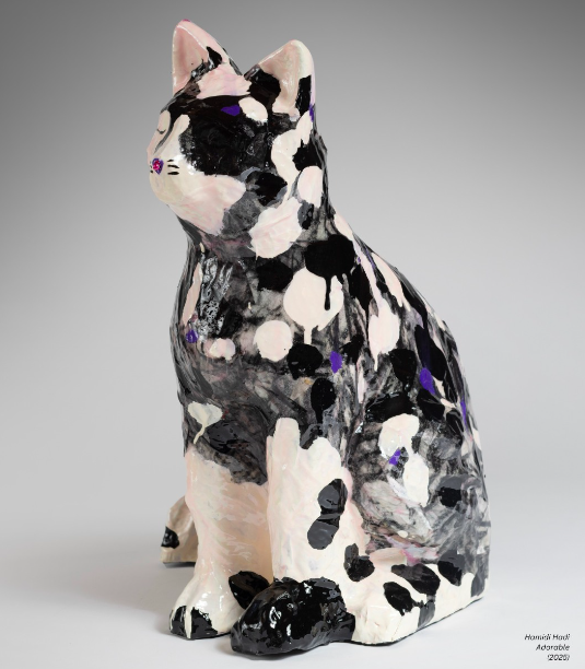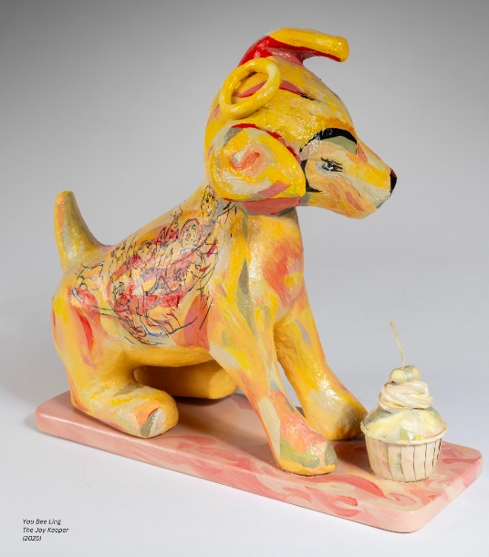 Her piece, Si Cempuk, features a cat adorned with a bow made from paper-mache scissors, a nod to her artistic process.
