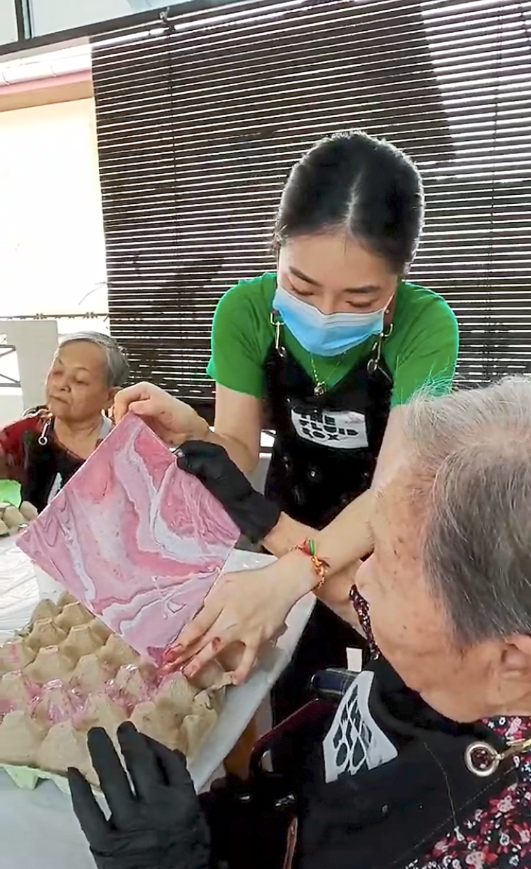 Teo (centre) spent her 32nd birthday teaching fluid art to seniors at two nursing homes in Penang. Photo: The Fluid Box