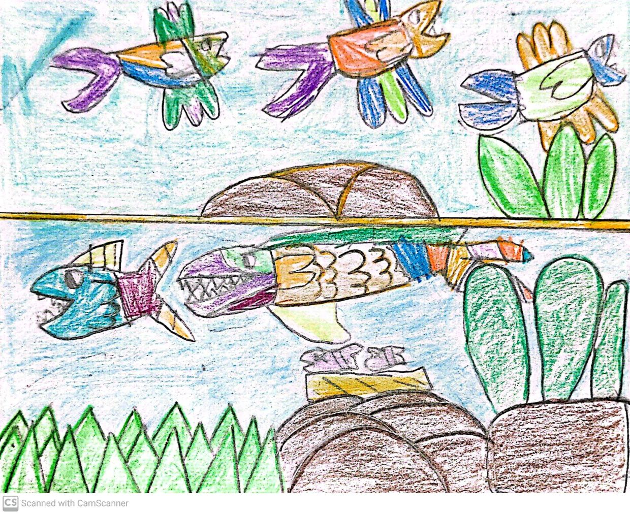 “My grandpa gave my sister and me guppy fish when we were younger. They lived in a small tank in our living room. We fed them pellets daily. At first, they were healthy, and we even had baby guppies. Sadly, as we became busy and sometimes forgot to feed them, the guppies eventually died,” writes Asher Wang Qi Chuen, six.