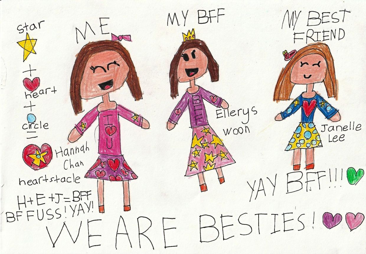 “My best friend’s name is Chen Shi. She goes to the same daycare and school as me. Although she isn’t in the same class, we are still best friends. Sometimes, in daycare, we like to do arts and crafts together. We share our art papers and lend each other stationery. We also have our tea break together. I hope our friendship will never, ever, ever fall apart,” says Wong Jie Ern, eight.