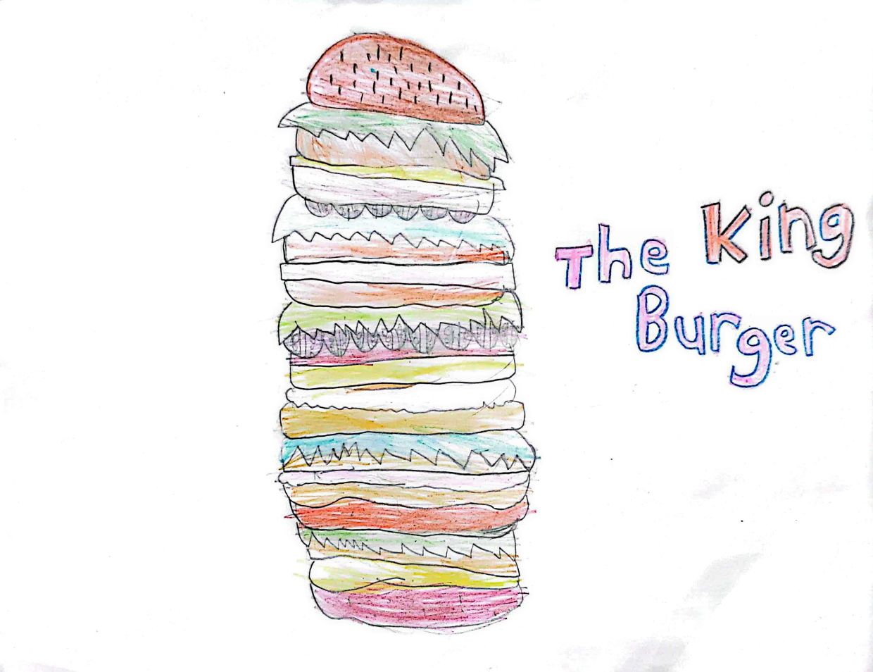 "I would like to name my food creation ‘King Burger’. It is the world’s largest and juiciest burger with many toppings and fillings. It has fresh tomatoes as well as tomato sauce. One burger can feed five people,” says Asher Wang Qi Chuen, six.