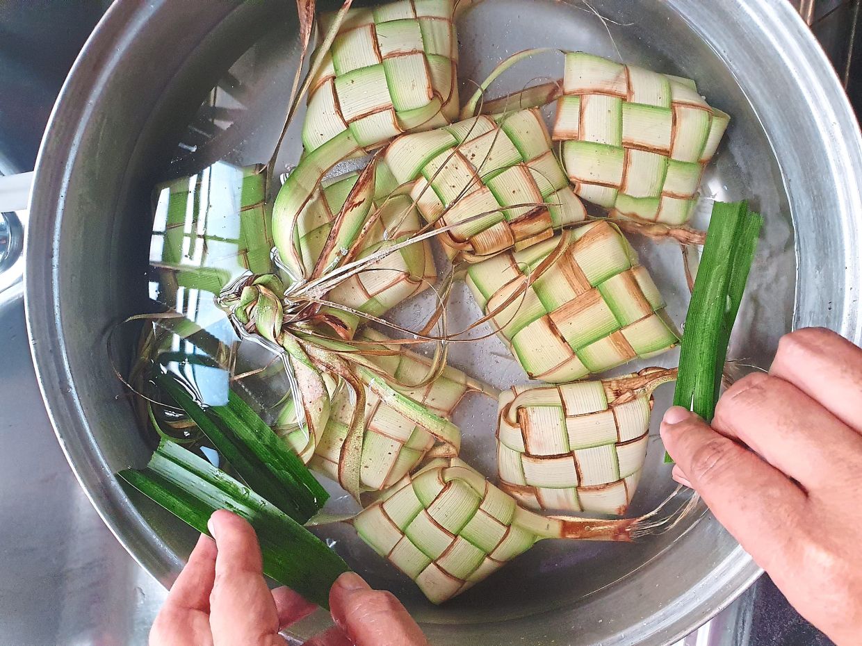 Each year, she prepares about 50 pieces of ketupat. Ketupat is a traditional food item made of rice and cooked in shells weaved from coconut leaves. They are then boiled for several hours until the rice is cooked.