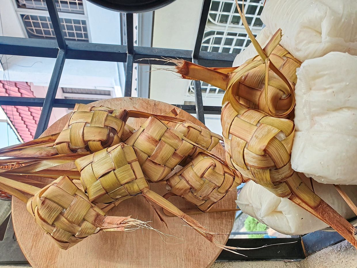 “It looks nothing close to ketupat bawang or ketupat nasi. The hardest part is interlocking the leaves in a crisscross pattern that is firm,” she laughs, showing her mother the misshapen weave.