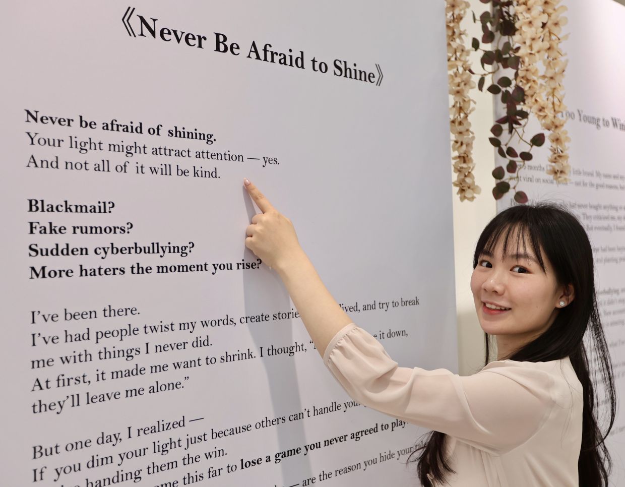 Her exhibition is a testament to this resolve. It featured stunning floral installations alongside a story wall – a deeply personal space where both Cherng and others share their personal experiences, struggles and mental toll arising from cyberbullying and other trauma.