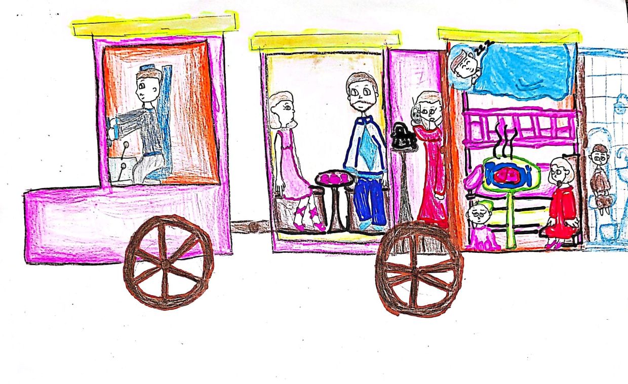 “My dream train is big, fast and very colourful with 20 carriages. One carriage is a library. Another is a playground with slides and trampolines. There is also a food carriage which has lots of food including different types of main course, ice cream, soup and fresh fruit for everyone to enjoy while they travel.”