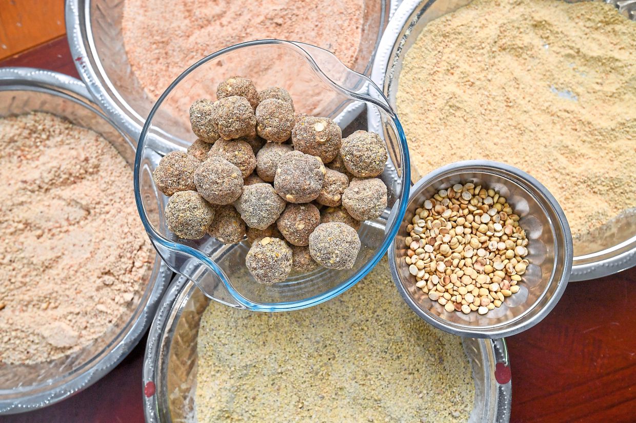 The process is lengthy and requires patience — from washing and sun-drying the ingredients to roasting, blending, preparing the jaggery syrup to the right consistency, and finally shaping the mixture into balls.