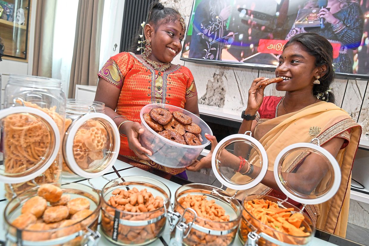 Harshani Rajendran, nine, (left) and Harini Loganathan, 14, enjoying traditional Deepavali treats prepared by Santhi.