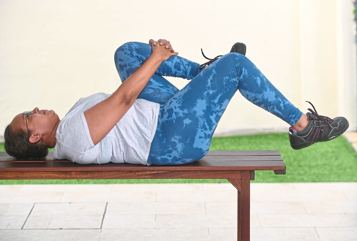 Normal: Lie on the edge of a sturdy table, bring one knee to your chest and let the other knee hang off the edge, keeping the lower back flat on the table. If your thigh is touching the table and your hanging knee is roughly at a 90° angle, you don’t have hip flexor tightness. — Photos: ONG SOON HIN/The Star