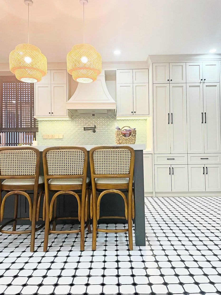 Black-and-white floor tiles and woven design elements are seen in the kitchen. Photos: ruma.kyra/Instagram