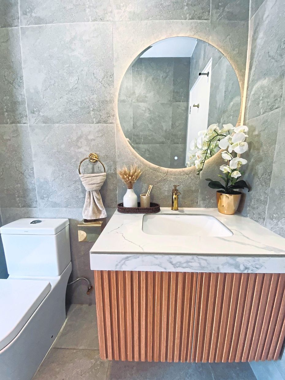 “The fluted vanity cabinet with marble- patterned countertop and round lighted mirror accentuate the luxe feel, making the bathroom very warm and inviting. We love every bit of it!”
