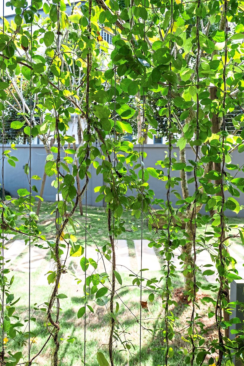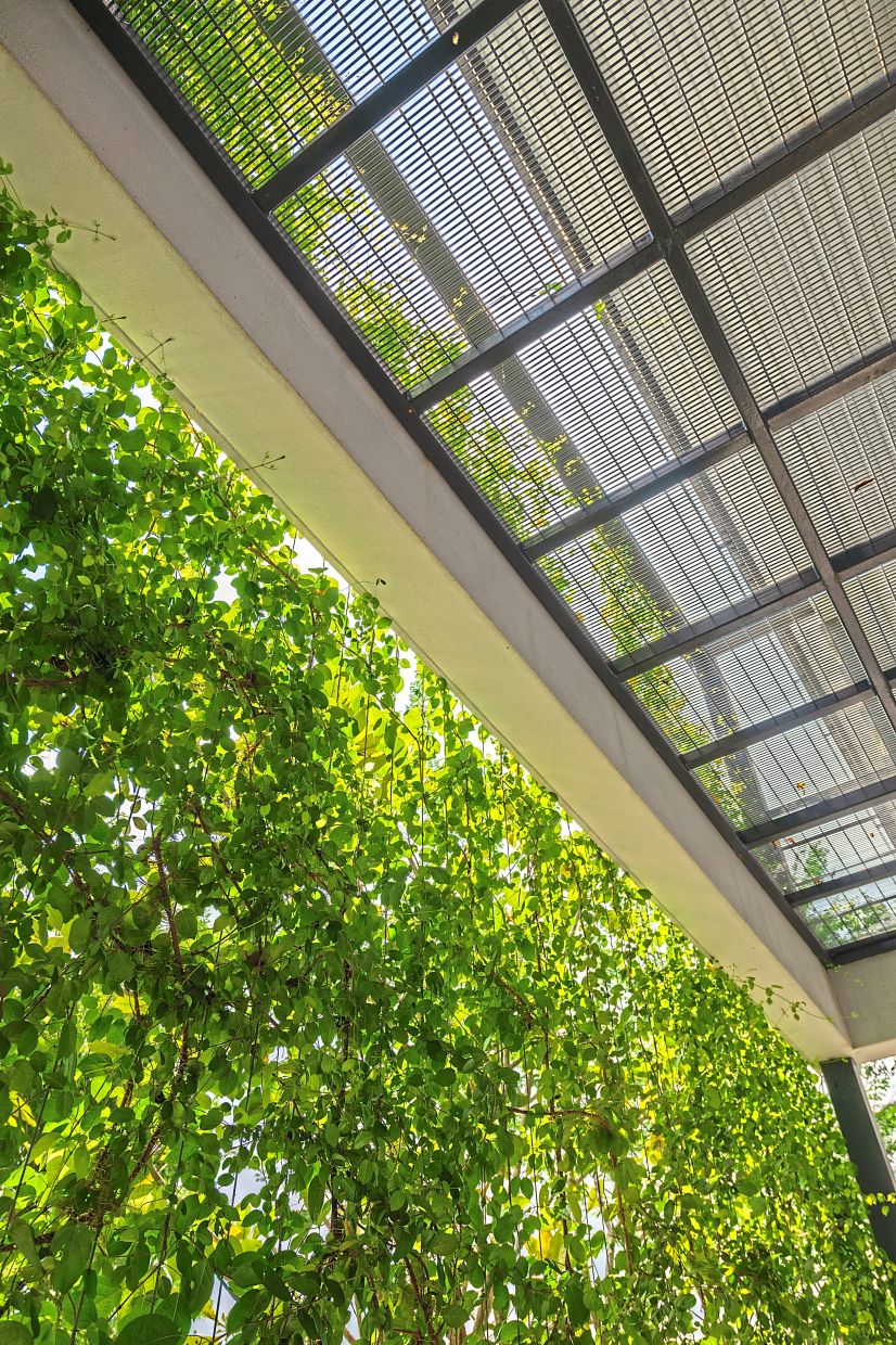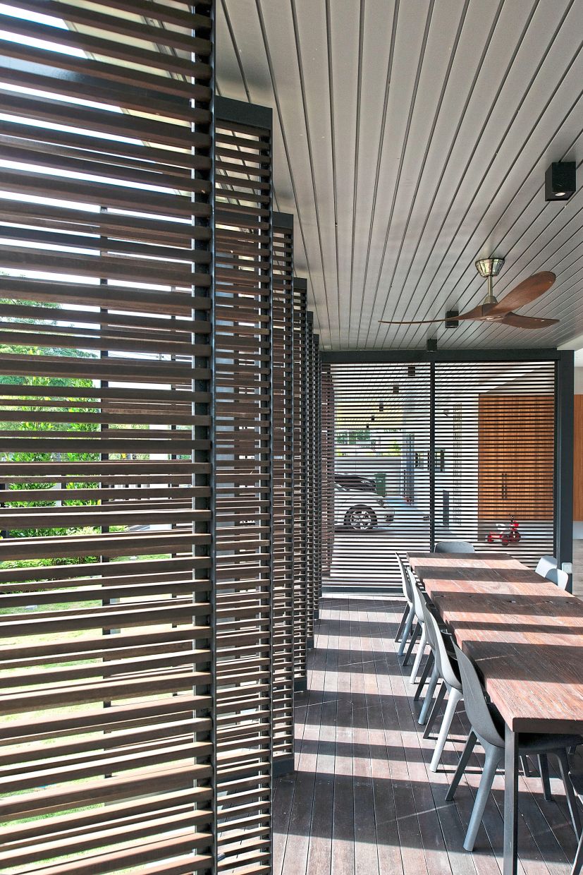 “The screen on facade, or double-skin facade design, is made out of a green wall, pivot timber screens and concrete ventilation blocks to create a buffer-zone effect to prevent heat from directly penetrating the internal living area,” explained lead architect Lau Ming Ngi, adding that the green wall consists of climbing plants that hang on vertical wires.