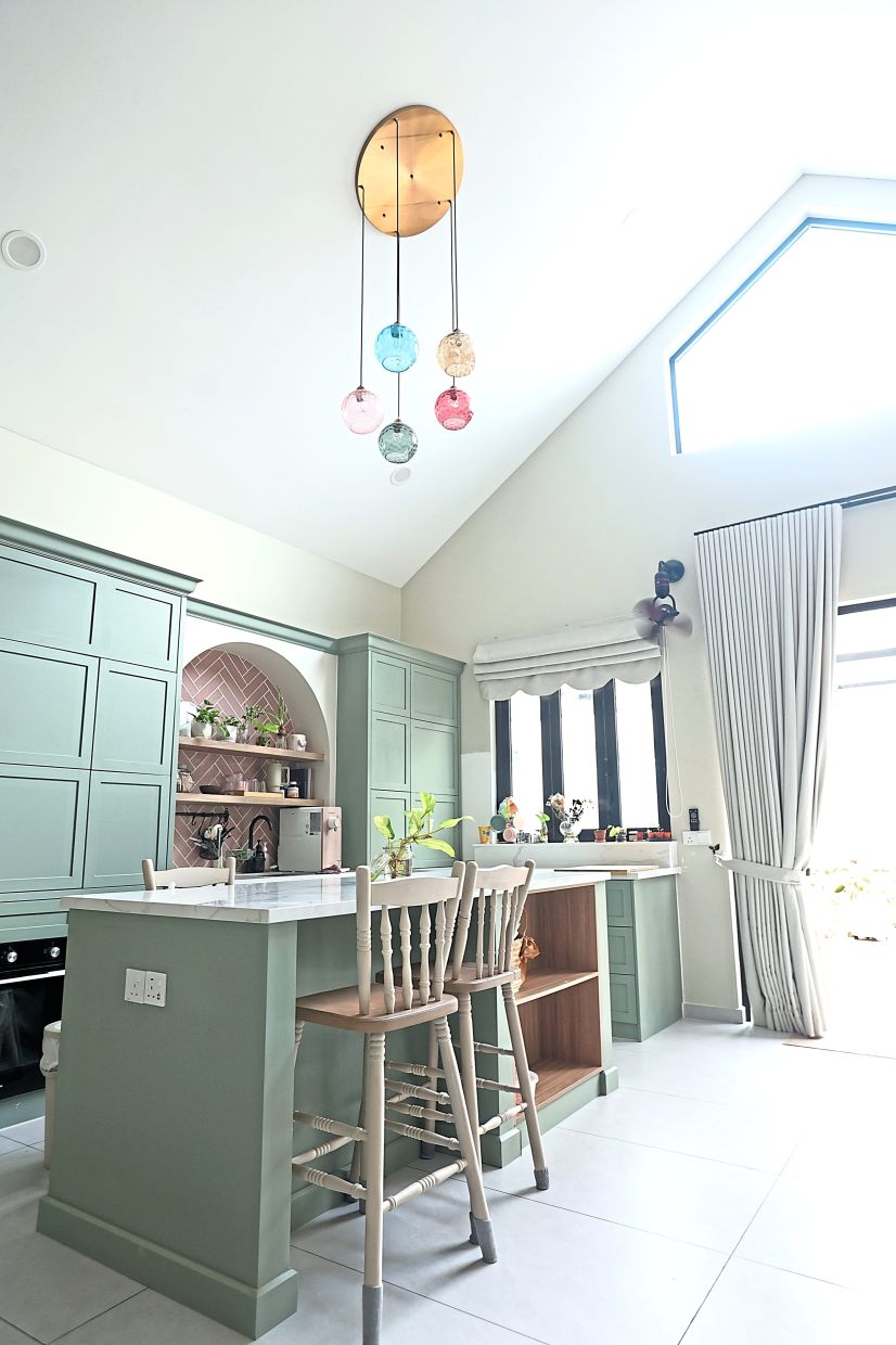 Their property is in a busy suburb in Klang Valley, surrounded by greenery. The first thing that catches the eye is the arched front door in green.