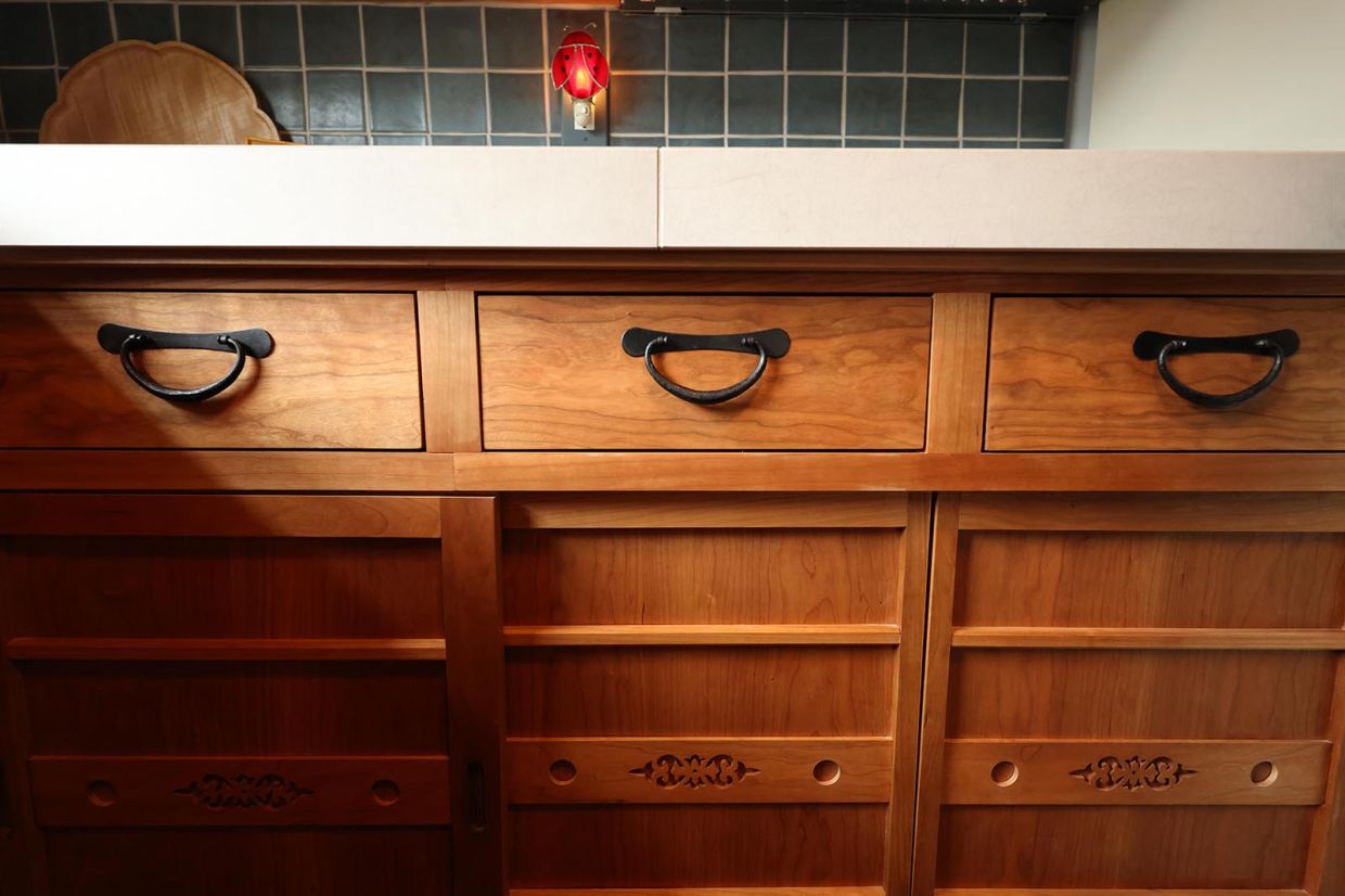 Many walnut cabinets, augmented by a handmade tile backsplash from Mission Tile West in South Pasadena, feature a decorative inlay floral pattern, a common motif in Japanese woodworking.