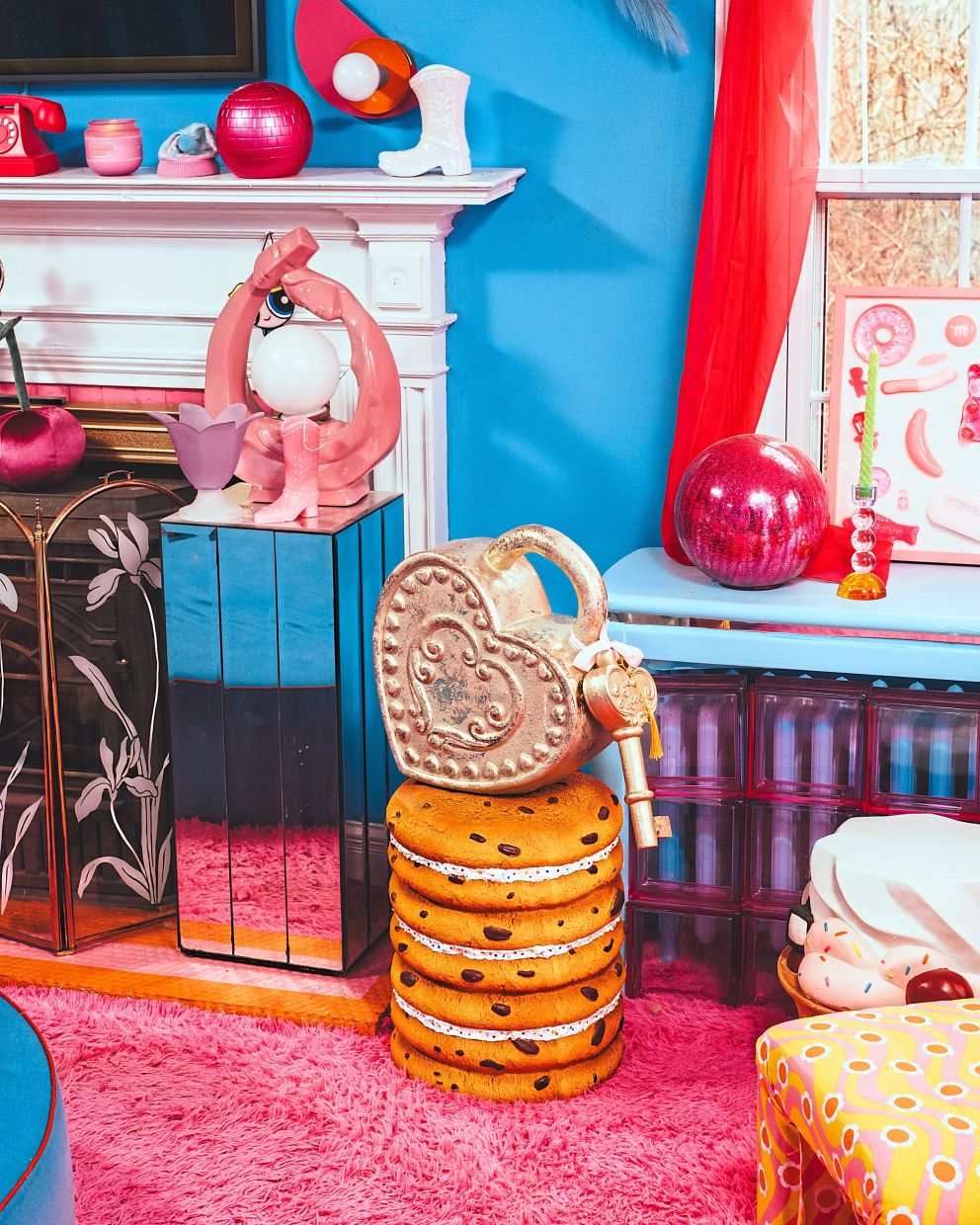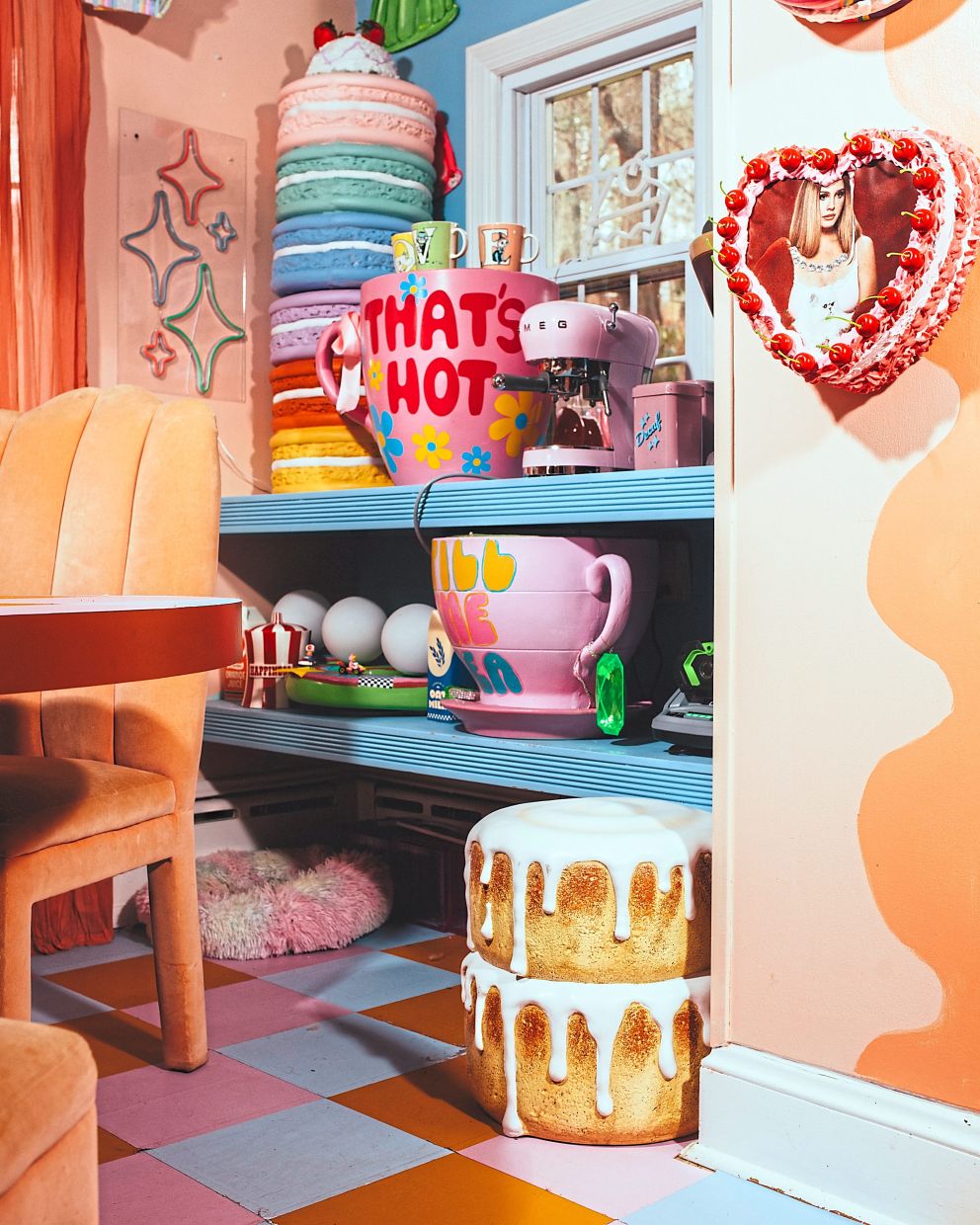 Throughout her home are other colourful, oversize objects, including a table shaped like a giant spool of thread, a large multicoloured wristwatch and 10 other food stools, including a wedge of cheese.