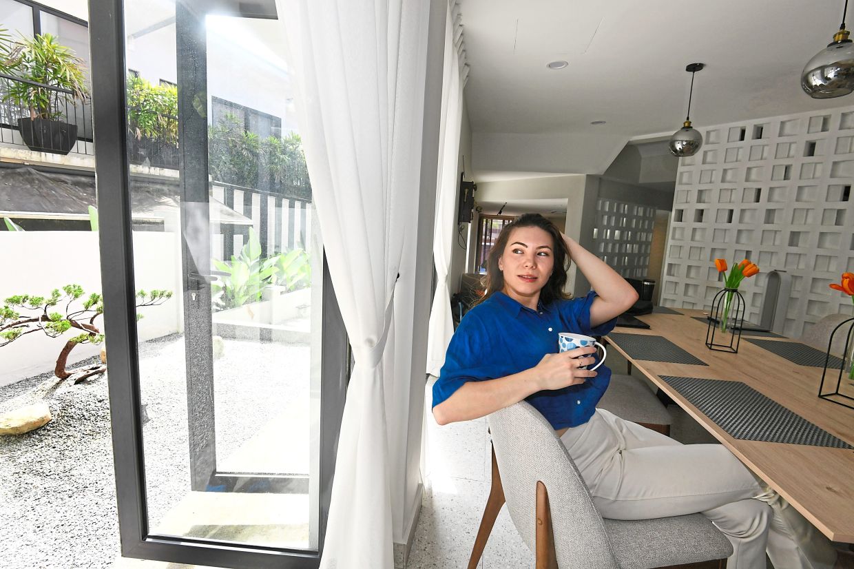 The third floor, once a bedroom, has been converted into a vibrant entertainment space opening up to an unexpected jungle backdrop, offering privacy from the neighbourhood.