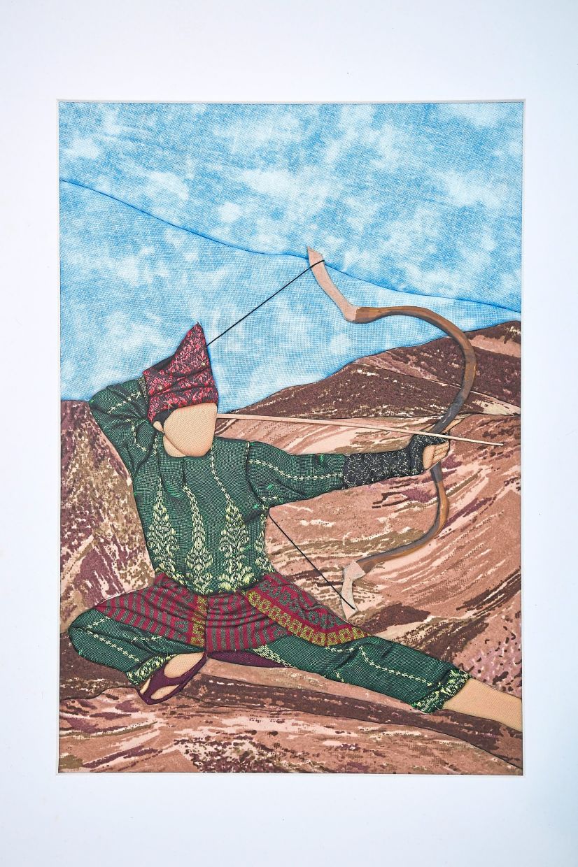 One artwork, for instance, features fabric from a 75-year-old sarong belonging to her sister-in-law’s husband, worn when he was just seven. Another uses real sari fabric for Indian traditional dress figures.