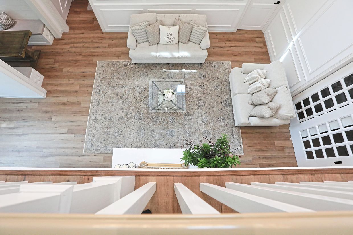 Beautiful wood-like flooring adds to the rustic feel, as does the sleek yet dramatic black chandelier illuminating the living area that includes a faux fireplace and sculptural side tables.