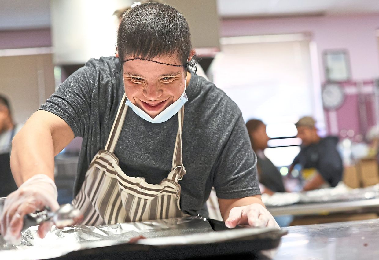 Jesus M. (left) and Donna M. use an ice cream scoop to portion cookie dough at Gateway to Learning.
