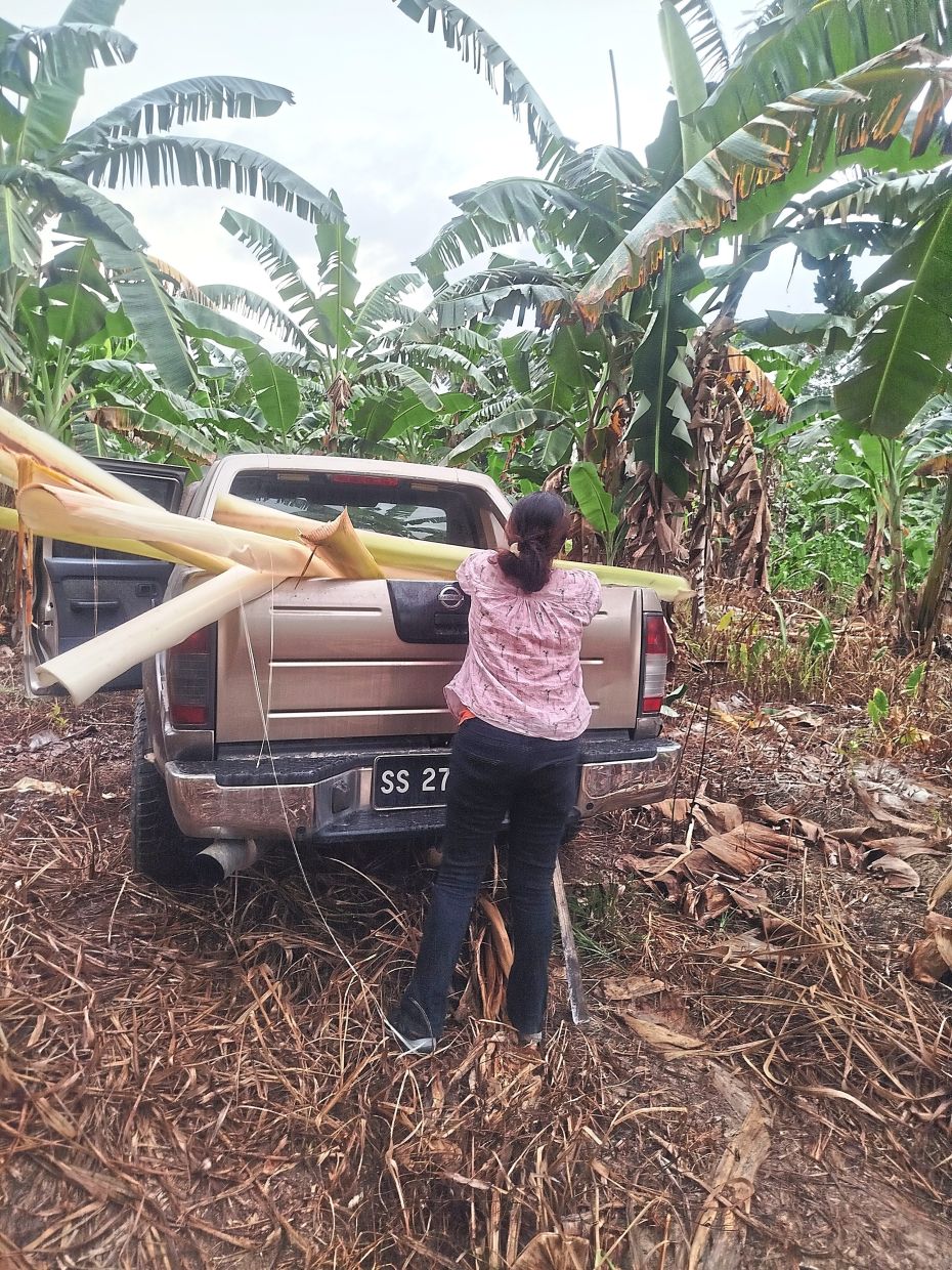 Hanisa loads freshly cut banana trunks into her car, ready to be processed into fibre for crafting.