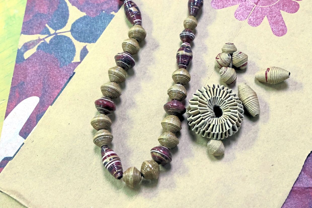 With five other sustainabilityminded crafters, she sells her handcrafted paper bead accessories, which include earrings, necklaces and bracelets in shapes such as round, oval and hourglass, in a wide range of colours.