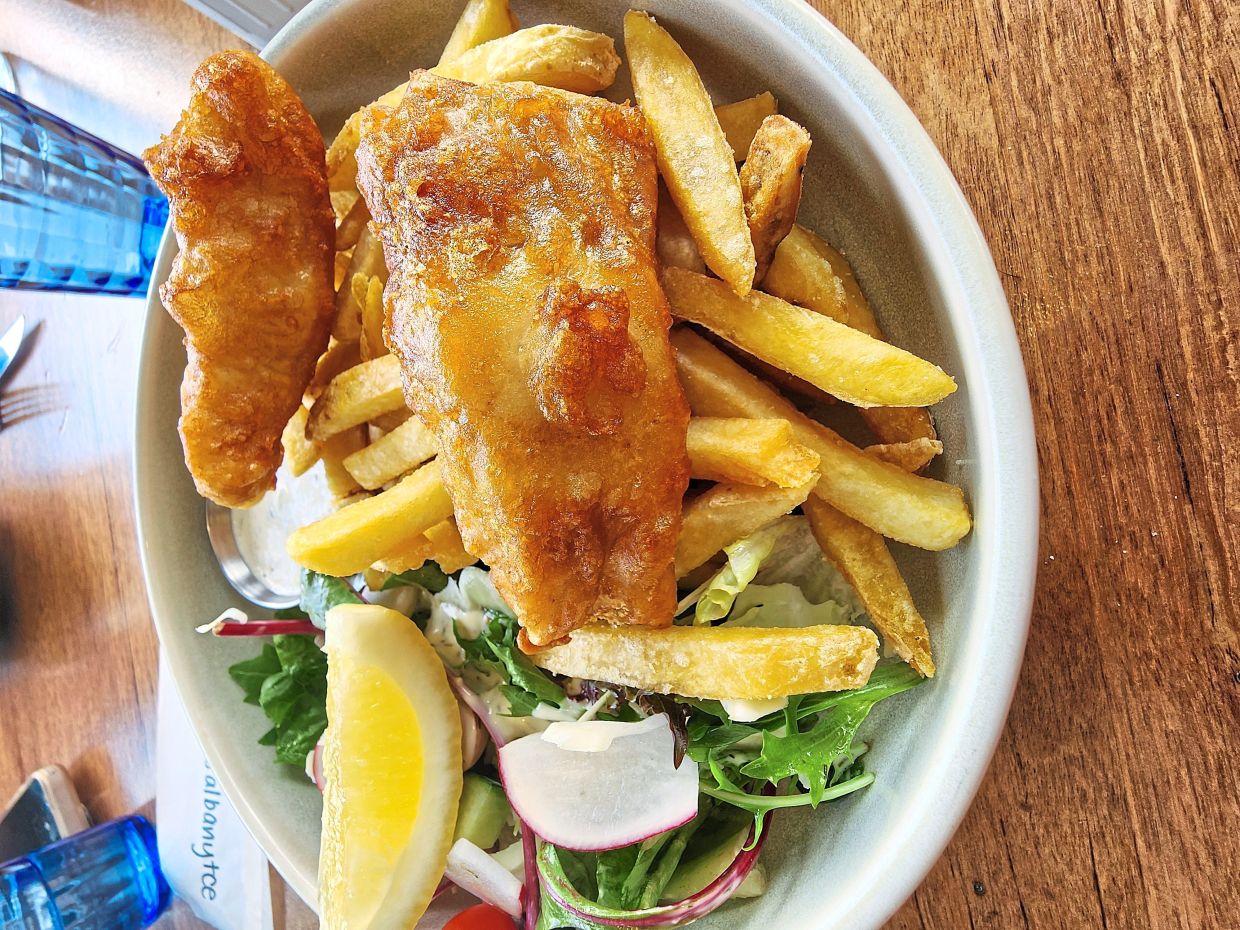 The eatery is vibrant, sun-drenched and fun and famed for its fish and chips – essentially beer-battered Augusta shark with chips, lemon and tartar sauce. The fish is fabulously good – hearty, tenderly yielding flesh buried under a crisp, firm shield that crackles like it really means business.