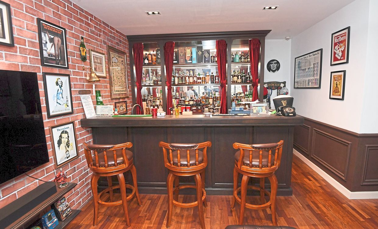 Disguised within the forest- green wallpaper is a concealed door leading to Max’s “man cave” – a British-style pub complete with a bar, pool table, a large-screen television and other paraphernalia.