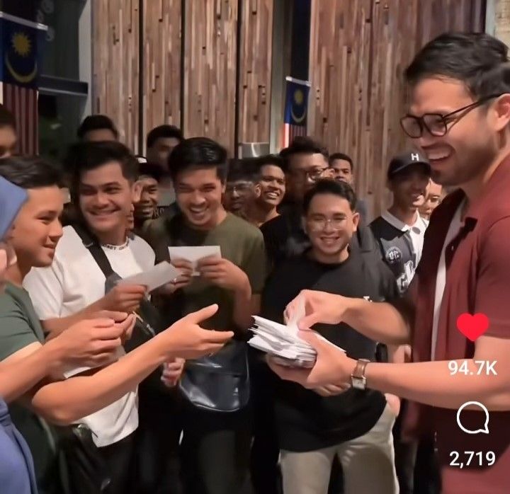 Khairul (right) surprises his staff with envelopes full of spending money. Screengrab: Khairulaming/Instagram