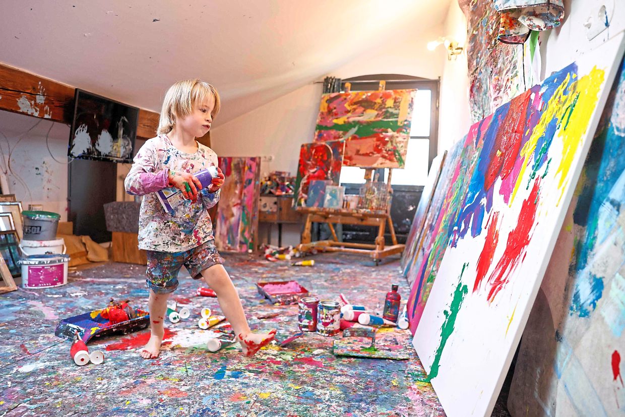In a studio his parents have set up at their home in the Bavarian town of Neubeuern, the toddler has been busy creating splashy artworks, often several times bigger than he is.