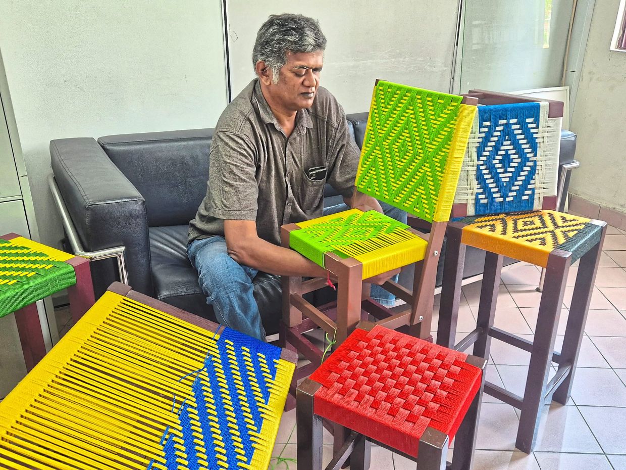 Saravanan's stools are reasonably priced, ranging from RM130 to RM160 each. It takes him about two days to weave the design and make a stool.