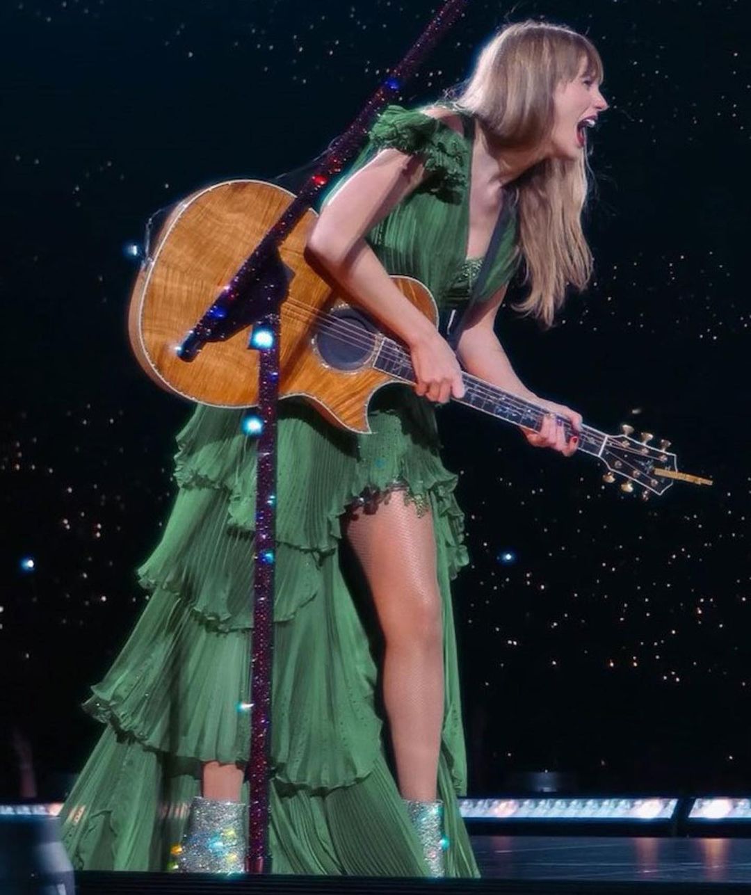 For her acoustics debut era, she switched to Jessica Jones. The green dress with tiered ruffles was a reminder of how she started with country music.