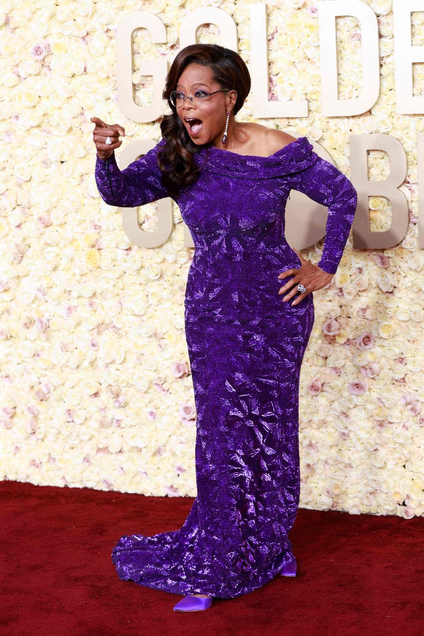 Oprah, in celebration of the film adaptation of The Color Purple musical, continued her purple streak in a fitted long-sleeve gown.