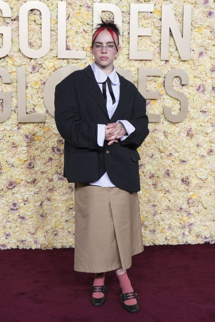 Billie Eilish, her hair bright red and black, went school marm in a white blouse, brown skirt and an oversized black jacket, eyeglasses in place. Her look was by Willy Chavarria.