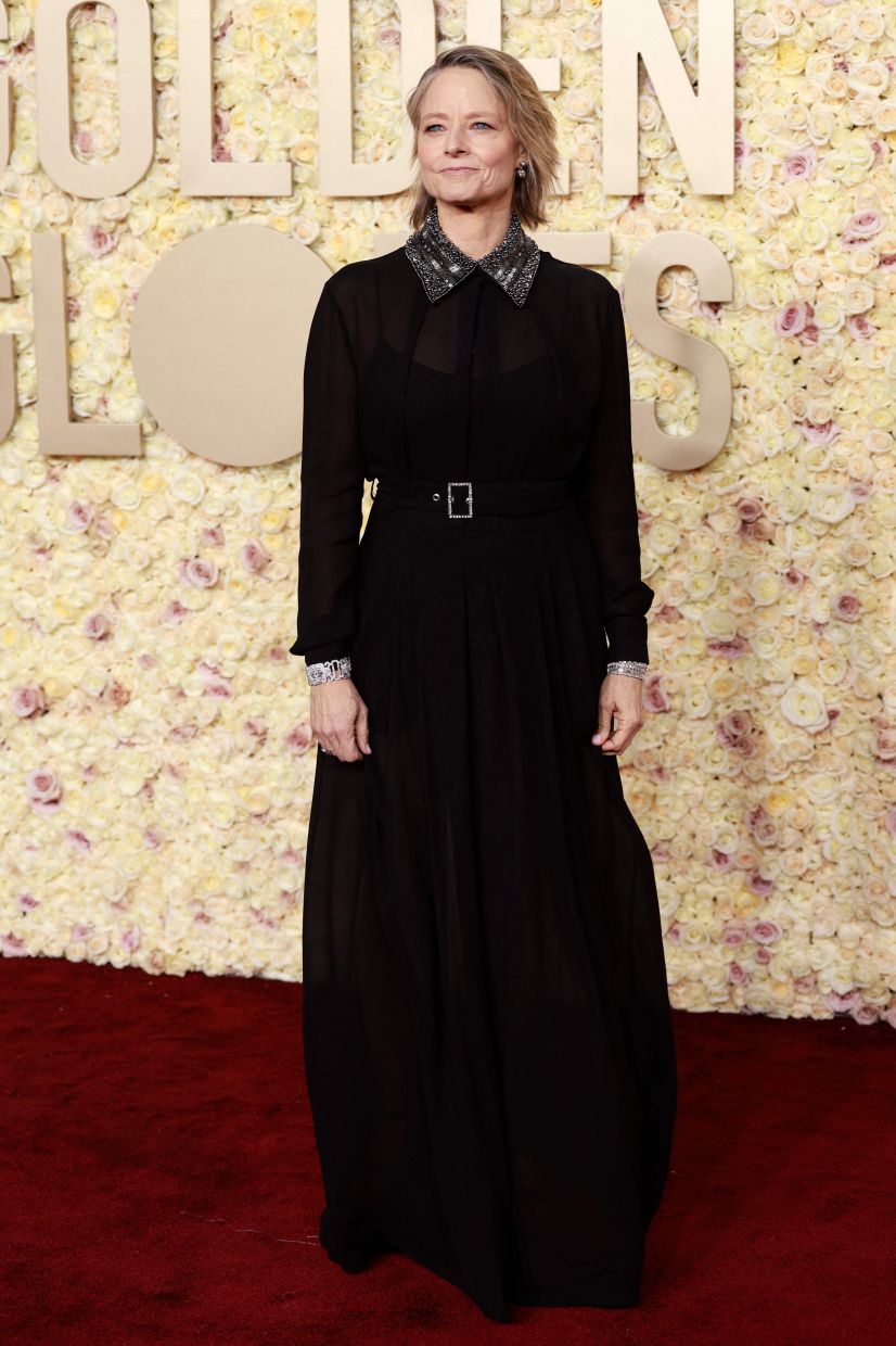 Jodie Foster channeled the same school marm, only this one was dressed up for a party with a high sequined collar and belt at the waist above a bulky pleated skirt. The designer: Alberta Ferretti. – AP