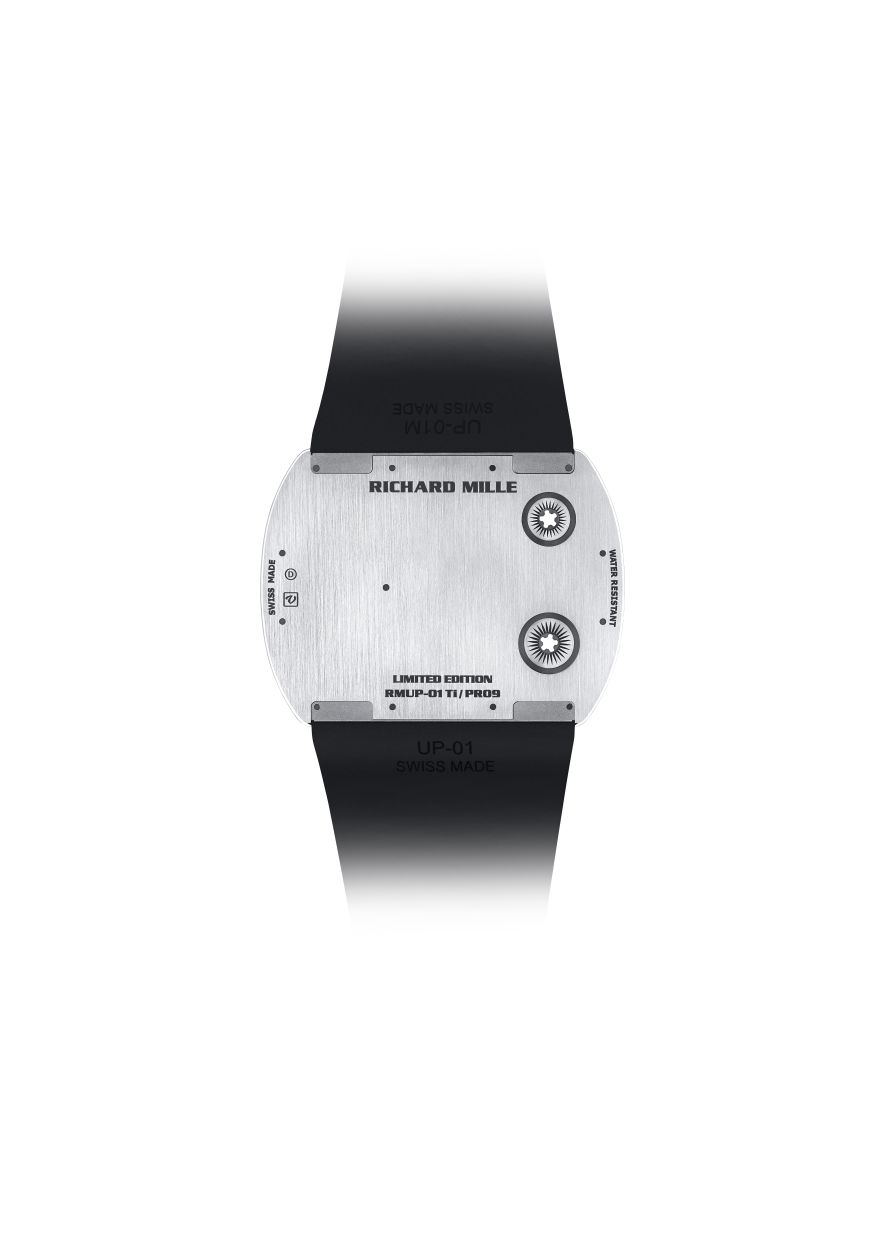 The RM UP-01 manual-winding movement with hours, minutes and function selector – capable of withstanding accelerations of more than 5,000 g’s – thus boasts a thickness of 1.18 mm, a weight of 2.82 grams, and a power reserve of 45 hours.