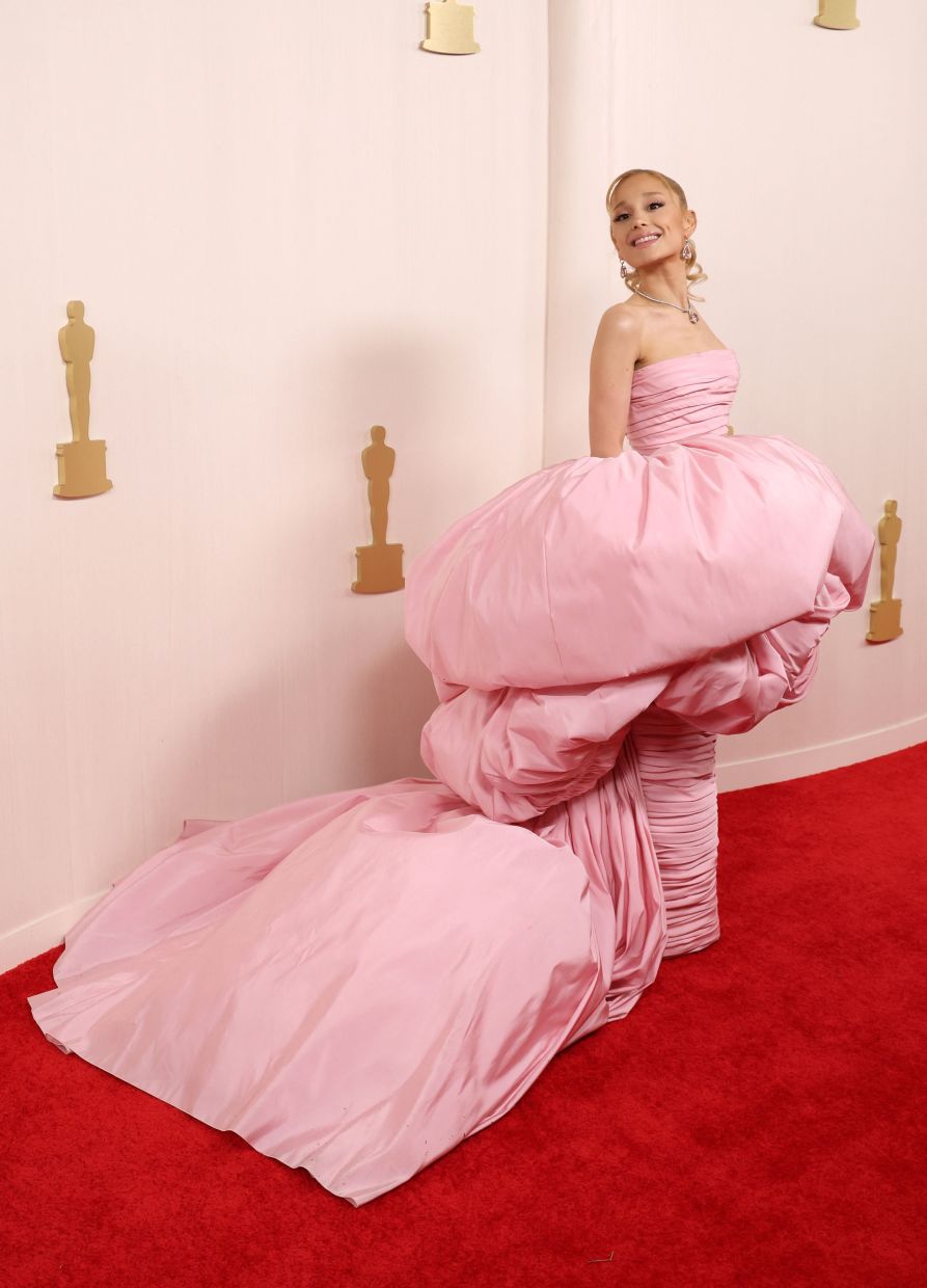 It was Ariane Grande who instead embraced pink. The singer and actress chose a bright and bold Giambattista Valli couture gown that featured waist attachments and a trailing train.