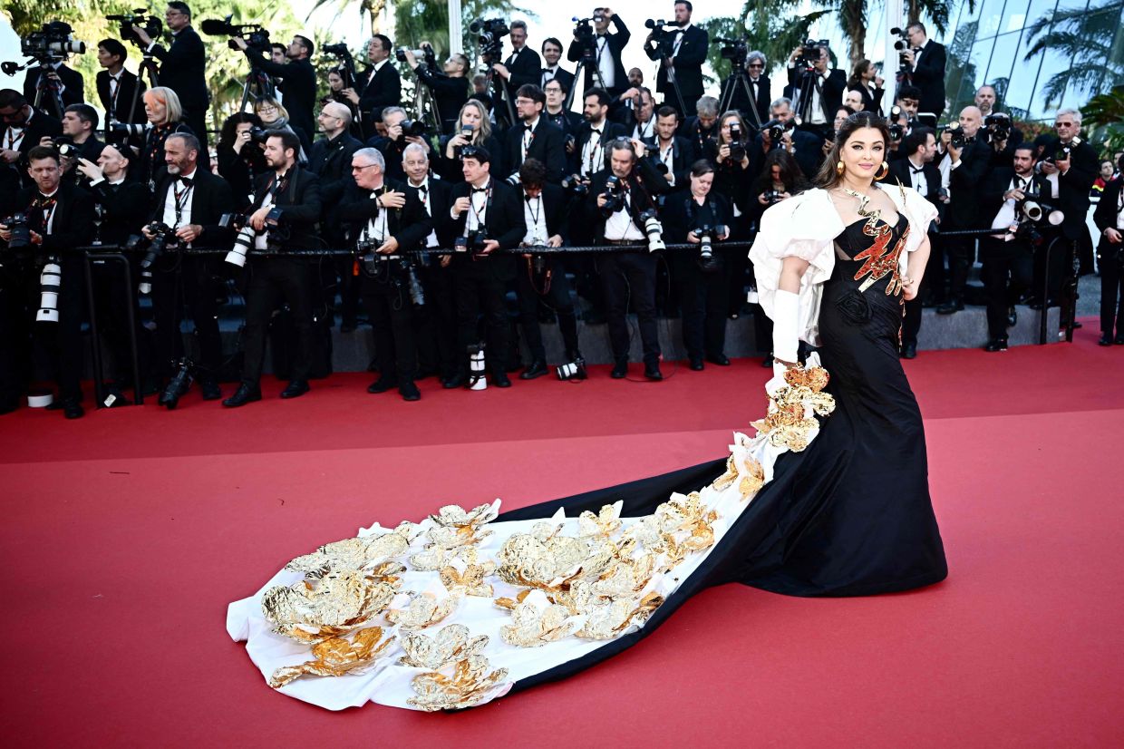 The Falguni Shane Peacock gown she wore to one film premiere sported puffy white sleeves and a long cape with embellished golden flowers all over.