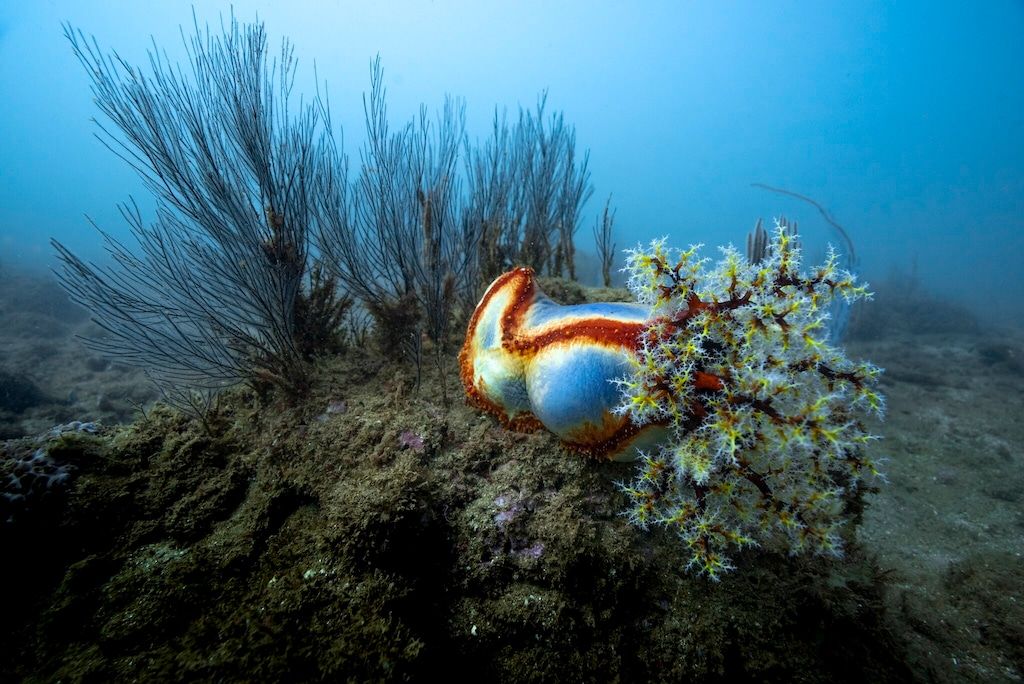 Soft coral species and a sea apple at an unsurveyed site in Exmouth Gulf. The extensive, sheltered waters of the gulf and its variety of ecosystems are home to an exceptionally high level of biodiversity. Photos: Rolex/Tom Cannon