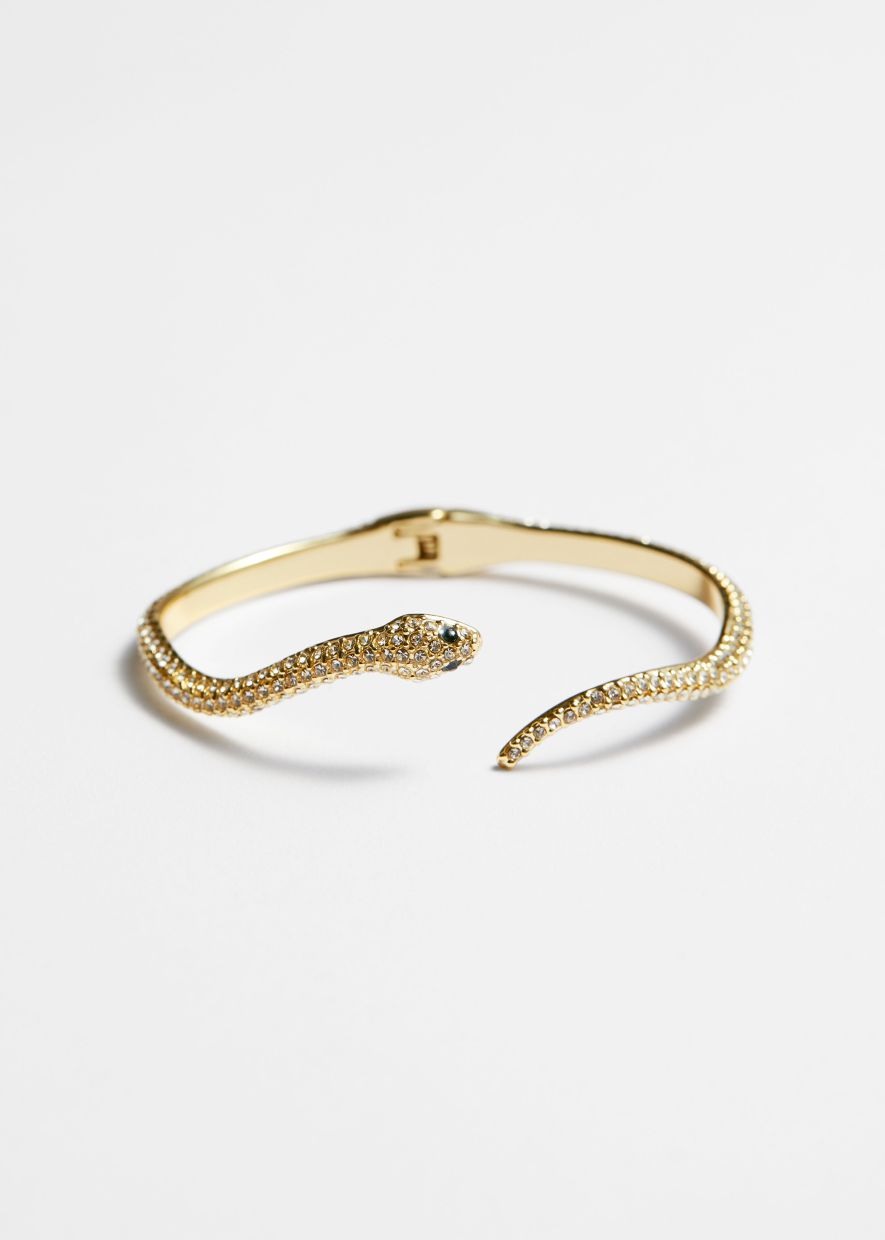 There is the & Other Stories cuff bracelet designed to look like a snake wrapped around your wrist. Made from polished brass, it is dotted with blue crystals as eyes and topped with a sparkling white crystals.